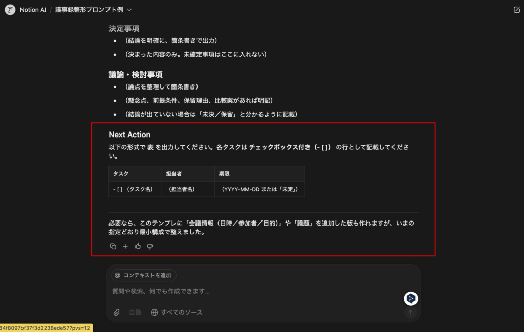 議事録の最大の目的は「次の行動」を明確にすることです。AIによって抽出された「Next Action」リストは、そのままNotionのタスクデータベースにドラッグ&ドロップできます。