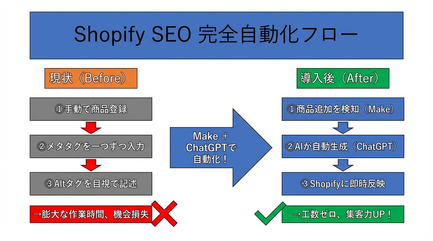 本記事では、ノーコード統合プラットフォーム「Make(旧Integromat)」と、OpenAIが提供する「ChatGPT API(GPT-4o)」を活用し、ShopifyのSEO実務をエンジニアリングの観点から完全自動化する手法を体系化しました。